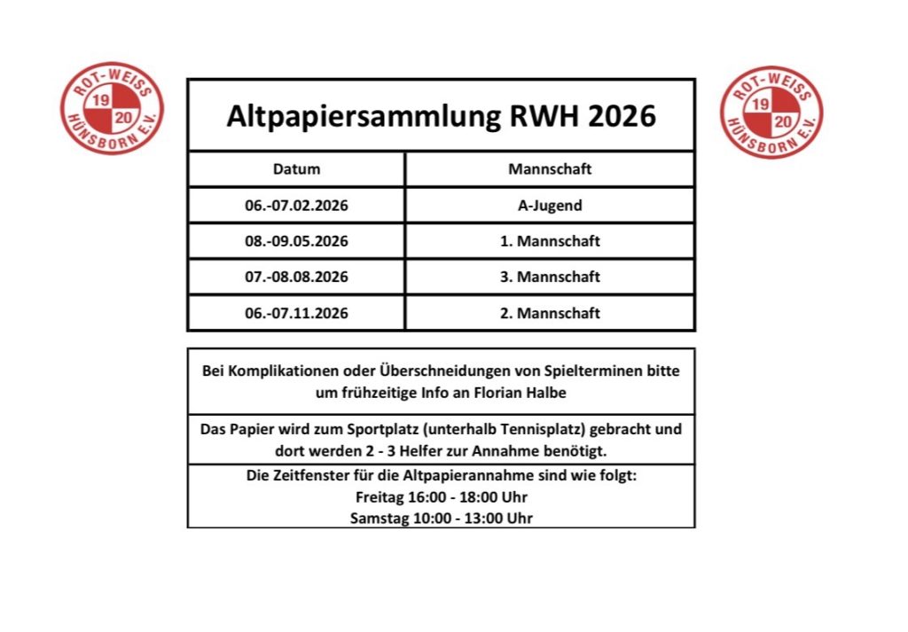 Das Altpapier wird am Sportgelände (unterhalb Tennisplatz) durch 2-3 Helfer innerhalb der Annahmezeiten entgegengenommen.