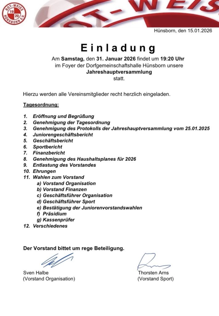 Der Vorstand des RWH lädt alle Mitglieder zur Jahreshauptversammlung am 31. Januar 2025 um 19:20 Uhr in das Foyer der Dorfgemeinschaftshalle in Hünsborn ein.