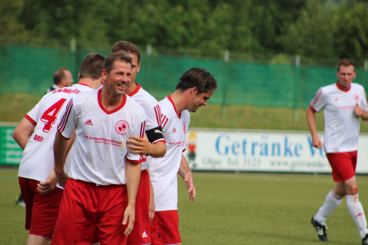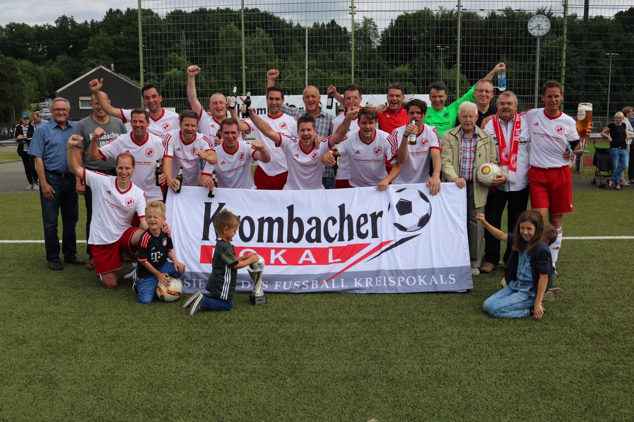 Der Pott ist zuhause. Durch einen 2:1 Sieg gegen die SgVg Olpe ist die Ü32 von Trainer Michael Niklas verdienter Kreispokalsieger. Tore durch Tormaschine Christian Schönauer und Henrik Blecker sicherten den Sieg. Hünsborn dominierte die erste Halbzeit, konnte aber den Ball im Tor nicht unterbringen. So dauerte es bis zur 47 min ehe Schönauer per Kopf das 1:0 markieren konnte. Nach einem Eckball schraubte er sich in Manier eines Anthony Modeste hoch und lochte ein. Das 2:0 wurde wunderschön von Jens Schlemper vorbereitet. Er tanzte zwei Gegenspieler aus und legte zurück auf den freistehenden Blecker, der eiskalt vollendete. Riesen Jubel bei den Hünsborner Fans. Zum Schluss der Partie wurde es unnötig spannend. Der Anschlusstreffer und ein verschossener Elfmeter von RWH brachten den Gegner ins Spiel zurück. Man konnte aber den Vorsprung verteidigen und verdient gewinnen. Es wurde mit den unzähligen Fans bis tief in die Nacht gefeiert. Ein Frühschoppen auf dem Flugplatzfest rundete das Party Wochenende ab. Nur der RWH!!!